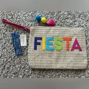 Add a vibrant pop of color to your summer wardrobe with this Francesca’s "FIESTA" straw clutch. Crafted from a textured, woven straw material, this bag features bold, multi-colored embroidered lettering that spells out "FIESTA" in purple, yellow, teal, lime green, orange, and pink.