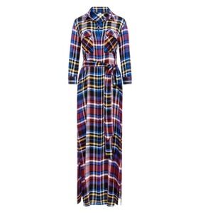 L'AGENCE Cameron long plaid shirtdress in women's size medium. This elevated designer piece is crafted from a soft, fluid 100% viscose fabric with a beautiful drape. Features a button-front silhouette, long maxi length, self-tie waist, chest pockets, and side slits for ease of movement.