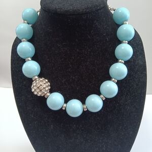 This stunning necklace features large vibrant baby blue beads complemented by elegant silver crystal and rhinestone large bead. Feminine, romantic and vintage. It wears just a little past the collarbone or longer due to a silver adjustable clasp as pictured. It's in excellent pre-loved condition.