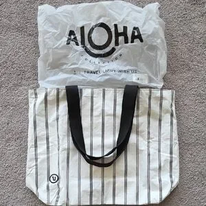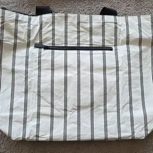 Stylish tote bag with black and white stripes. Features black handles. Perfect for travel or daily use.