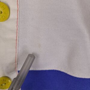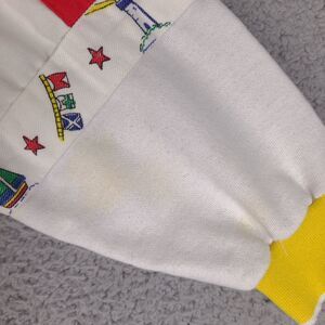 Used with stains on front, back, and sleeves. Size and info tag is washed out. See measurement photos to ensure fit.