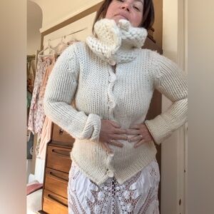 Super soft, cozy off-white wool cardigan with large button up Peter Pan collar