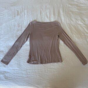 Express Supersoft Fitted Boat Neck Long Sleeve Tee in a mauve/light purply pink color. Perfect as a base layer. Double lined in the front but not the back.