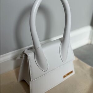 Sophisticated mini bag with a sleek white finish. Features a structured design and gold logo detail. Perfect for elevating any outfit.