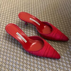 Like new red satin Manolos! Only worn once, half size too small on me sadly. Perfect for Valentine’s Day 💝
