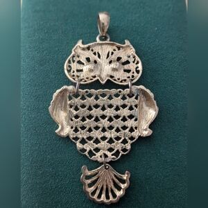 3 owl pendants in gold and silver tones with rhinestone eyes.