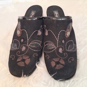 Chic black clogs with floral embroidery. Stylish and comfortable for any event. made by Brighton. these are in excellent condition with minimal signs of wear