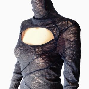 Emo, rave, party, club, night out, cutout, sheer, lace, stretch, high neck blouse