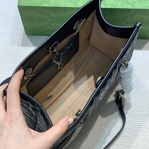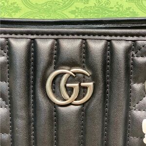 Chic Gucci shoulder bag in black quilted leather. Features silver chain accents and iconic logo detail. Perfect for stylish outings.