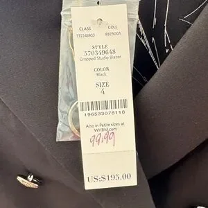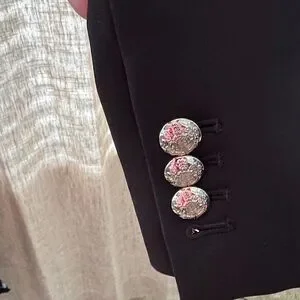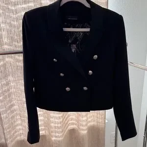Chic black blazer featuring double-breasted design. Accented with silver buttons for a modern touch. Ideal for professional or casual wear.