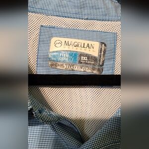 Comfortable blue plaid fishing shirt by Magellan Outdoors. Lightweight with ventilation in back. Two front pockets. Features moisture-wicking fabric and relaxed fit. See pictures for measurements. EUC.