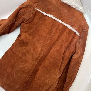Stylish brown jacket with shearling collar. Features button closure and front pockets. Perfect for a classic look.