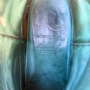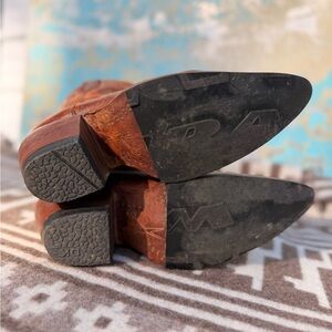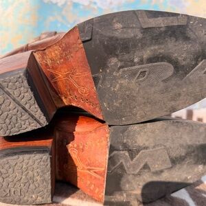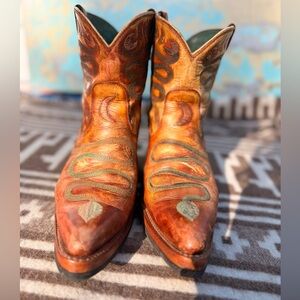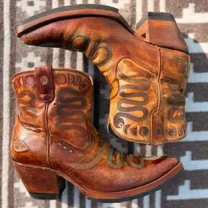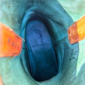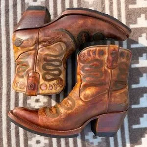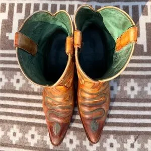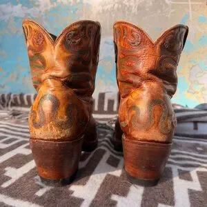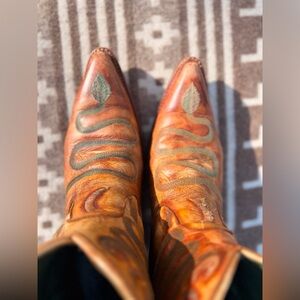 These are custom Paul Kaufman x Mimi Elashiry Junction Eastern boots! I had these made for my birthday a few years back…they’re absolutely gorgeous. The boots were hand dyed to a dusky orange brown and the snakes tinted turquoise. Turbo soles added recently and barely worn. Size 11B in women’s.
