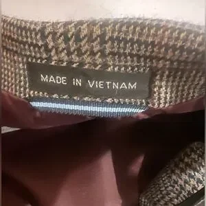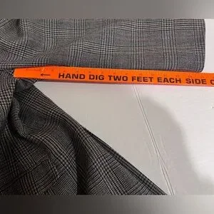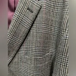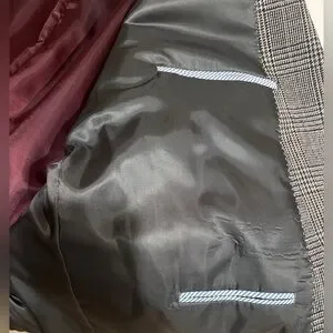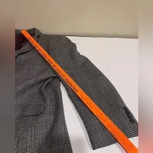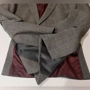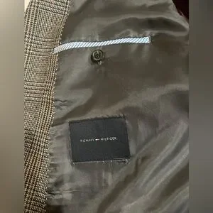 Tommy Hilfiger Classic Gray Plaid Men's Blazer, Sport Coat. Elevate your style with this classic gray plaid men's blazer. Side splits, 2 buttons in front, 5 button detail on cuffs, and brown smooth material on inside of jacket. Also has 3 pockets on the outside of the jacket and 3 inside of jacket pockets and a spot for a boutonniere on the lapel. Perfect for any formal occasion or business attire this blazer offers a sophisticated look.