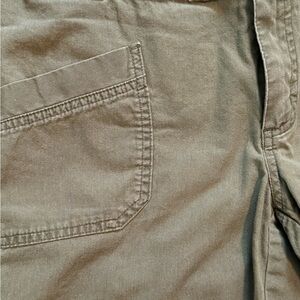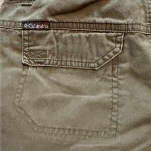 Ladies Columbia shorts in khaki green. Features two front pockets and two back pockets with velcro closure. Durable for outdoors adventures and versatile for casual wear. Previously worn, great condition. Smoke free environment.