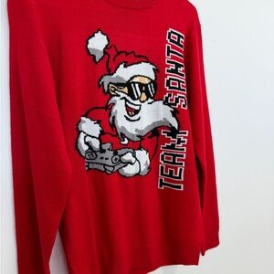 Fun Santa design with gaming theme. Perfect for holiday gatherings. Comfortable crewneck style.