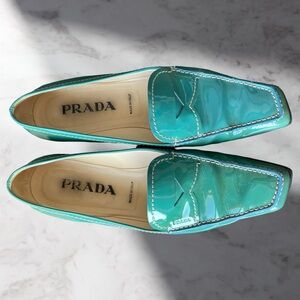 Elegant Voyage color loafers by Prada. Sleek patent finish in the Vernice group. Perfect way to own Prada shoes without breaking the bank! Dust bag included.