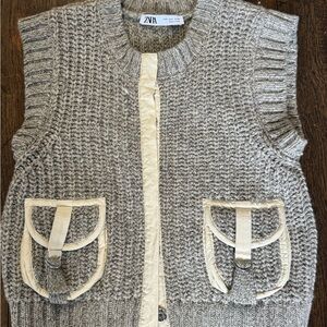 Cozy knit vest by Zara. Features cream details and front pockets.