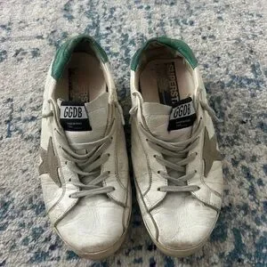 Golden Goose sneakers with a cream base and gray star detail. Casual and trendy design.