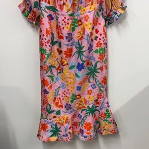 Bright floral midi dress with off-shoulder design. Features vibrant colors and playful pattern.