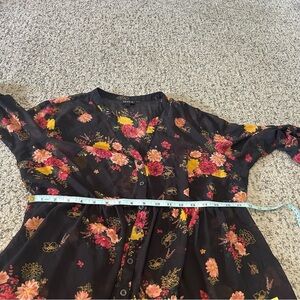 Torrid Black & Red Floral Lexie Chiffon Hi-Lo Babydoll Sheer Button-Up 3/4 Sleeve Tunic Top. It is see through. Please note that a Torrid size 00 translates to a US size 10. Photos of Torrid size chart and of approximate measurements posted above. In great preowned condition. No visible signs of wear. Feel free to make a a reasonable offer through the offer button!
