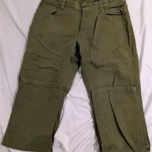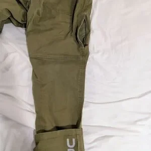 32/32, slim fit. Durable cargo pants in olive green. Tough canvas material ideal for outdoor adventures, but still flexible enough to move around. Features a side pocket and branding is visible with pant legs rolled up a little.