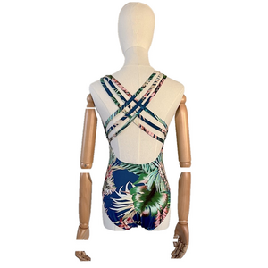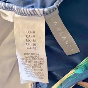 This La Blanca one piece swimsuit features a tropical print and V-neck with multi-strap cross back. New without tags, includes hygienic liner.