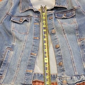 Stylish blue jean jacket. Classic button-up design. Perfect for casual wear.