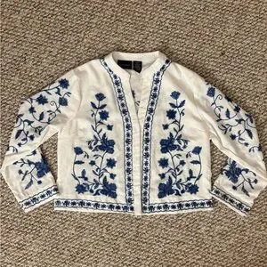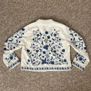 Floral Embroidered White and Blue Women's Blazer- Liv Los Angeles- M