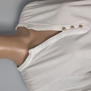 Design: Airy tunic silhouette with a split-V neckline and gold-tone button detailing.