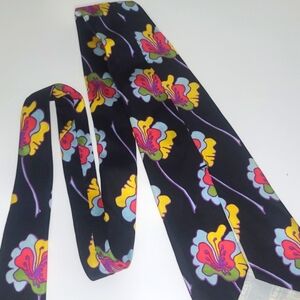 Peter Max Silk Tie Signed Pop Art Black w Hibiscus Floral Print Blue Pink Yellow