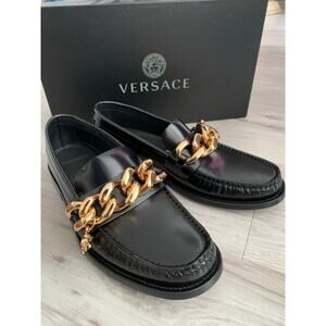 Step out in style with these brand new Versace Women's Leather Loafers! These stunning loafers are size 38 (US 7.5-8) and come to you new with tags, complete with the original box and dust bag. You will love the luxurious feel of the high-quality leather and the eye-catching gold hardware detailing. Perfect for adding a touch of elegance to any outfit, these Versace loafers are a must-have for any fashion-conscious woman. Grab them now and elevate your wardrobe with a touch of Italian luxury!