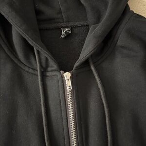 Stylish black zip-up hoodie with drawstrings. Perfect for casual wear.