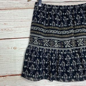 An easy pull-on skirt with a swingy ruffled hem. The border print was inspired by a traditional woodcut floral.