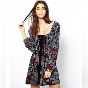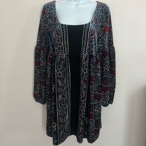 Stylish long sleeve velvet dress. Features intricate multicolor pattern. Perfect for any occasion. Looks adorable with boots or a good pair of pumps!