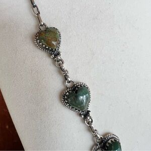 This Kingman turquoise heart station necklace features heart-shaped turquoise stones with deep green coloration and natural matrix, finished with an ornate drop pendant. Crafted in solid sterling silver, the floral and feather-style silverwork adds beautiful detail and movement while keeping the design balanced and wearable.