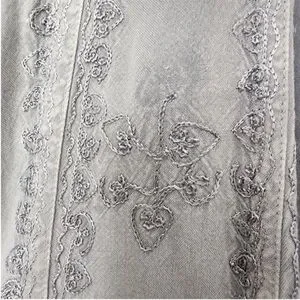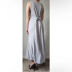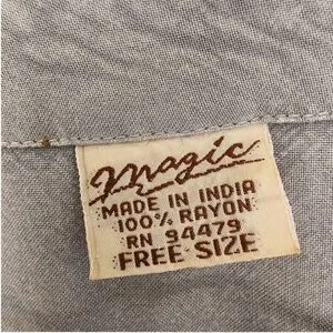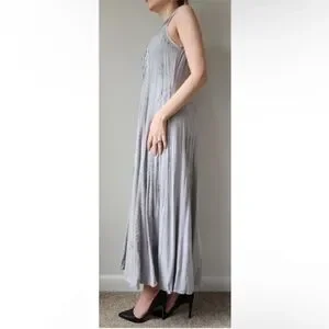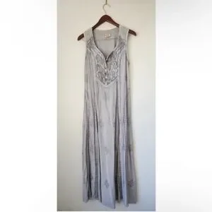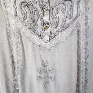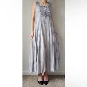 Sleeveless, scoop henley neck, long maxi length. Flowy silhouette. Ice light blue fabric with embroidery throughout. Shows up gray and silvery on camera, but more blue in person. Back tie to adjust fit. 100% rayon.