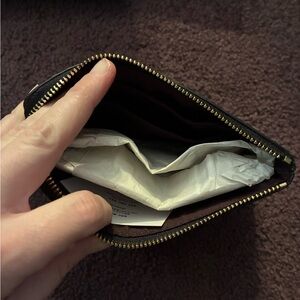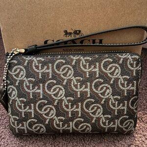 The item in the image is a Coach Corner Zip Wristlet featuring the brand's monogram print in a black, brown and gray colorway. It is a compact accessory designed for carrying essentials like cards, cash, keys, and a phone.