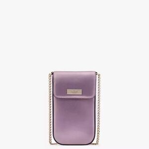 Chic lavender crossbody with metallic sheen. Features chain strap and sleek flap closure.