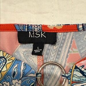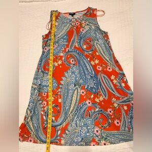 Chic dress with a multicolor paisley design. Features a mix of red, blue, and pink hues. Ideal for a fashionable statement.