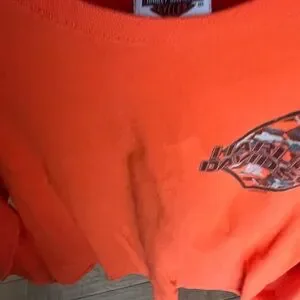 Vibrant orange tee with Harley-Davidson graphics. Ideal for casual wear or rides. Abernathy Harley-Davidson of Union City. TN. No size on shirt but believe it is XL