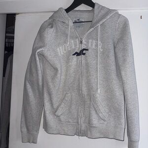 Soft light gray hoodie with zip closure. Features Hollister branding and hood.