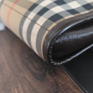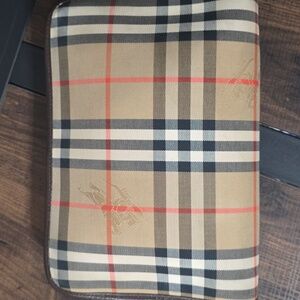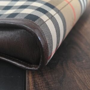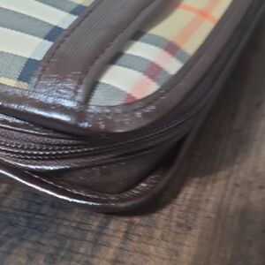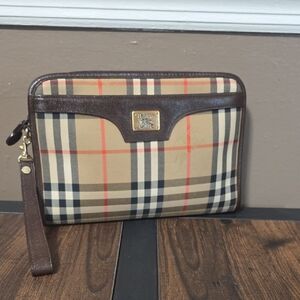 EXCELLENT VINTAGE BURBERRY PRE-OWNED ELEGANT BURBERRY CLUTCH WITH ICONIC CHECK PATTERN. FEATURES A SECURE ZIP CLOSURE CLUTCH/WRIST STRAP. INTERIOR HAS MAIN COMPARTMENT WITH SIDE ZIPPER POCKET. EXTERIOR HAS HUGE FRONT SLIP POCKET.