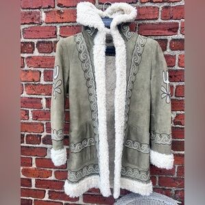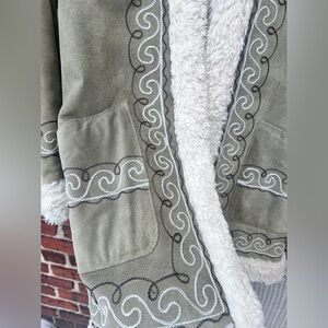 Chic olive jacket with cream accents. Penny Lane inspired. Cozy teddy lining. Stylish embroidery details.