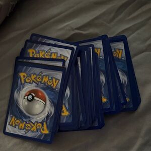 Stack of Pokemon trading cards. Iconic design with Pokeball. Perfect for collectors.