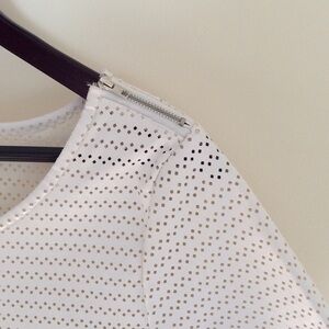 Combine two of this year's trends into one top: White-on-White and perforated. The top is faux leather (polyurethane) and has zipper detailing at the shoulders. The perforations are opened up where the chest meets the underarms (see last pic).