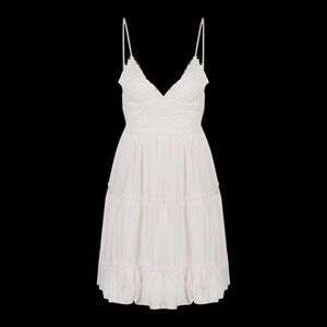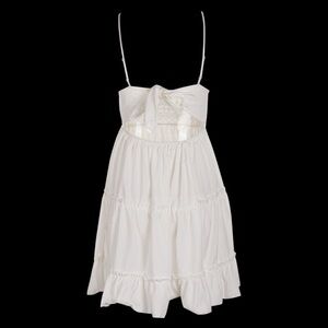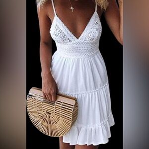 Step out in style with this chic white backless lace dress. Perfect for any occasion, its delicate lace and elegant design make it a must-have in your wardrobe. Custom made mini summer dress. This dress is backless and suitable for the beach. It can also be worn as a party sundress. The dress has a plunging V-neck and spaghetti straps. Dress is made of polyester silk with decorative lace top. It also has a tie in back that will make bow. Comes in white only. Note: dress only comes in XL. Size runs small. Size 10