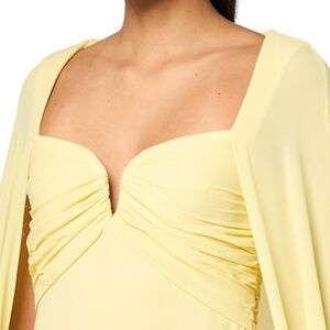 Chic maxi dress with a flowing cape. Light yellow hue. Perfect for elegant occasions.