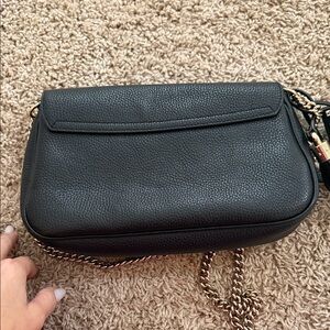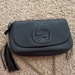 Chic Gucci crossbody in black pebbled leather. Features iconic logo and tassel detail. Stylish chain strap for easy wear.