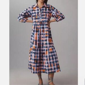 MAEVE ANTHROPOLOGIE The Bettina Tiered Shirt Dress Buttondown Blue Plaid Size XS